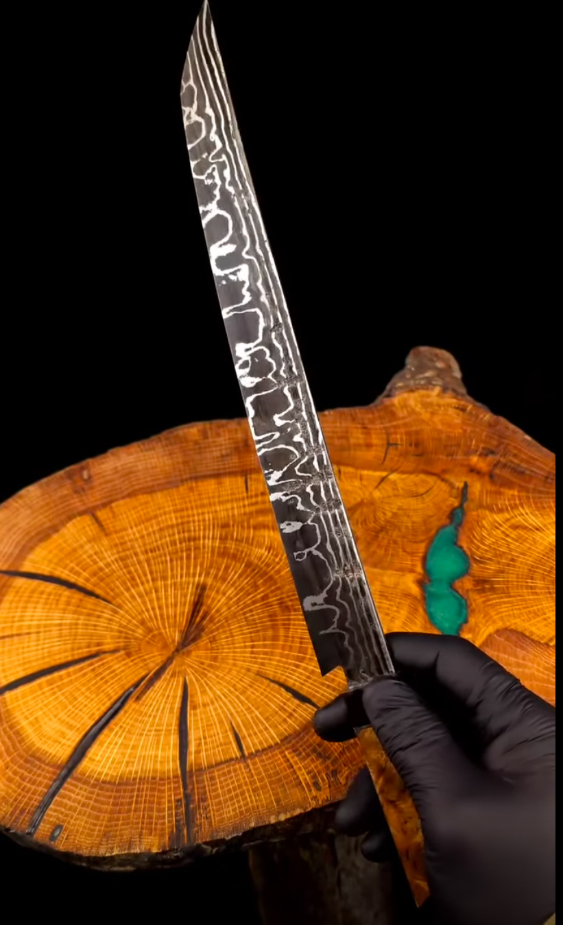 Cuchillo utilitario de cocina fabricado de acero de damasco (multilaminado) forjado a mano, de unas 200 capas. Cachas fabricadas de nogal americano y nacar natural de abulón.